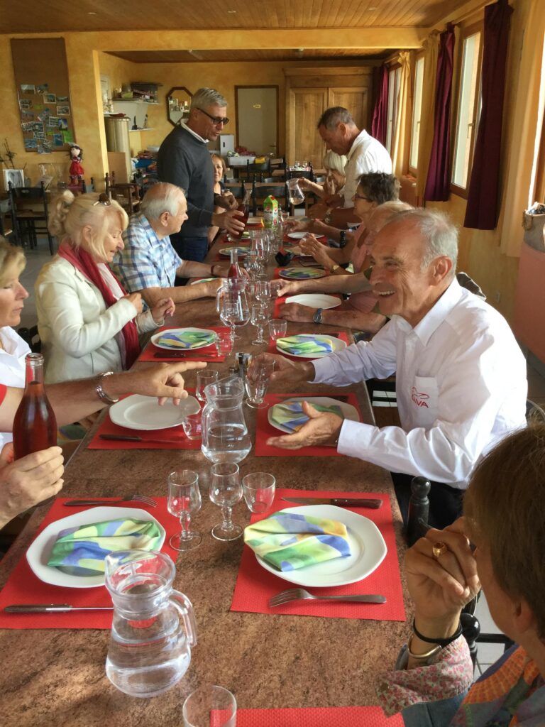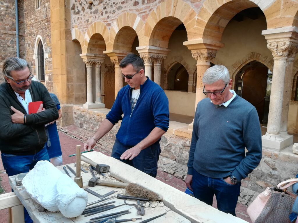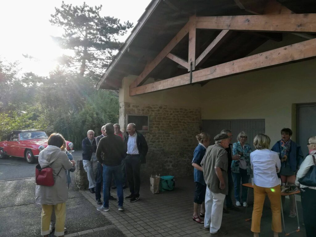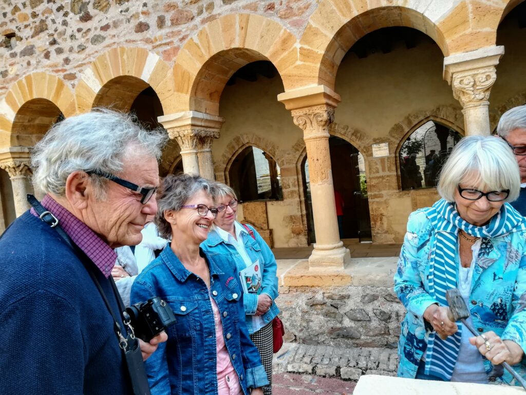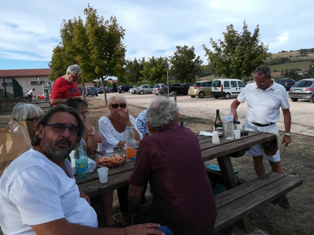 Après un bref et chaleureux petit déjeuner à Civrieux d’Azergues, lieu de départ de la sortie du jour, nous avons pris la route en direction de Salles Arbuissonnas pour la visite du Prieuré. Un tailleur de pierre faisait démonstration de son savoir faire et a permis à quelques un(e)s de s’exercer en utilisant ses outils appropriés. Après cette visite, nous avons repris nos véhicules pour rejoindre l’auberge « Le Chatoux Fleuri » à Sainte Paule. La cuisine familiale avec légumes du jardin fut très appréciée par l’ensemble du groupe. Puis nous avons passé l’après midi à Oingt avec une visite commentée par un des fondateurs du musée de la musique mécanique. Là encore , certain(e)s d’entre nous ont pu s’exercer au maniement des manivelles. Nous avons poursuivi cette journée ensoleillée par la visite du donjon qui offre une vue à 360° et une promenade dans ce charmant village. Nous avons clos cette journée par le verre de l’amitié.