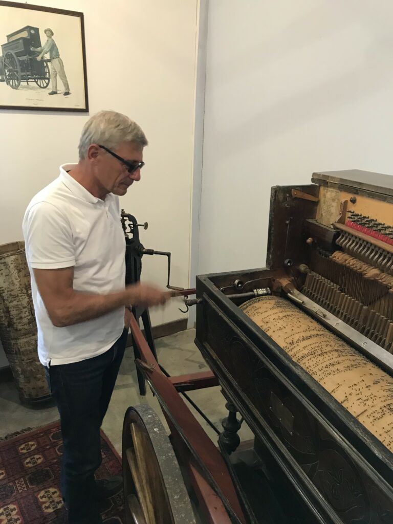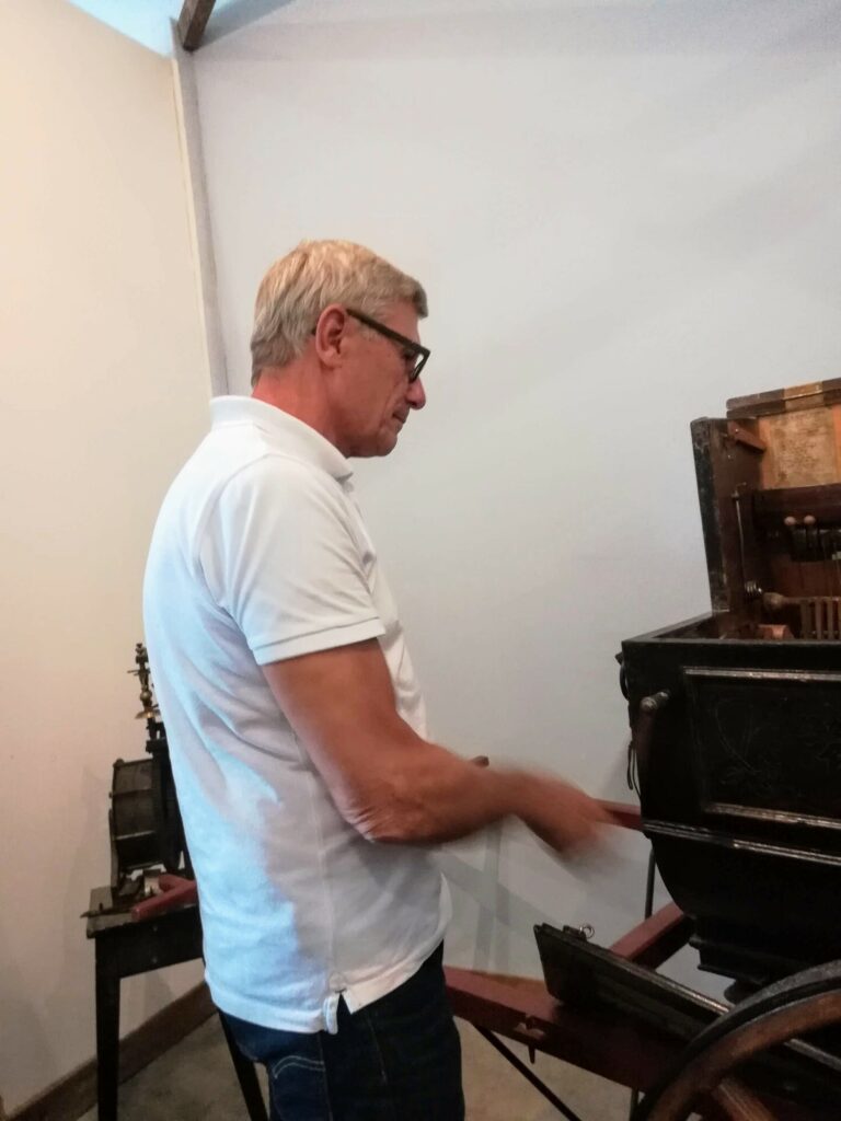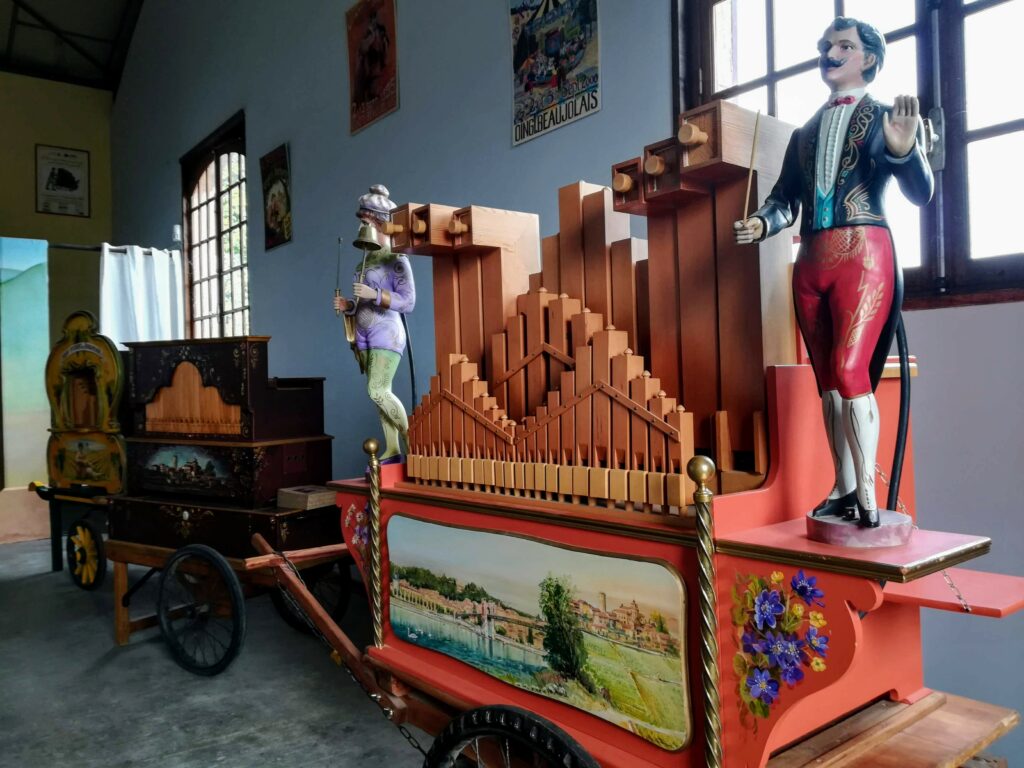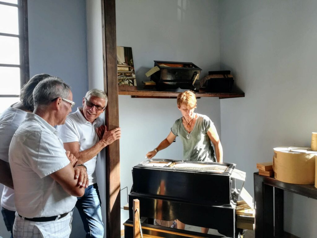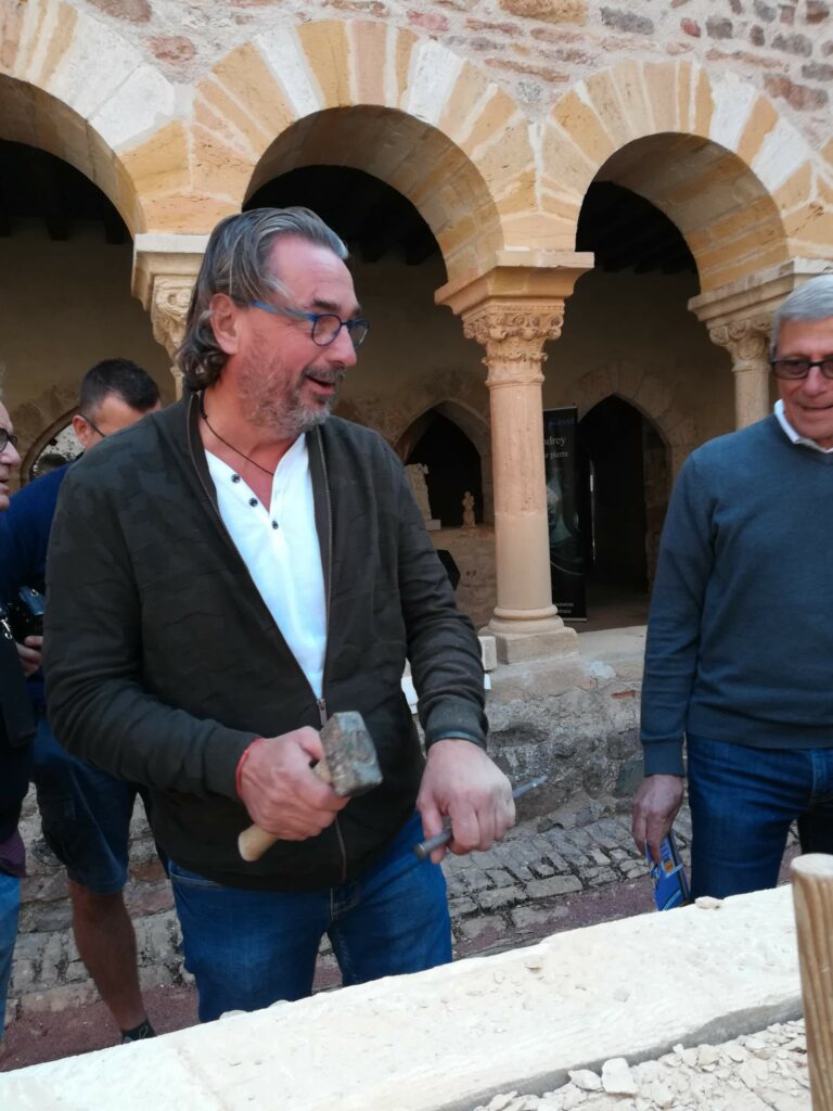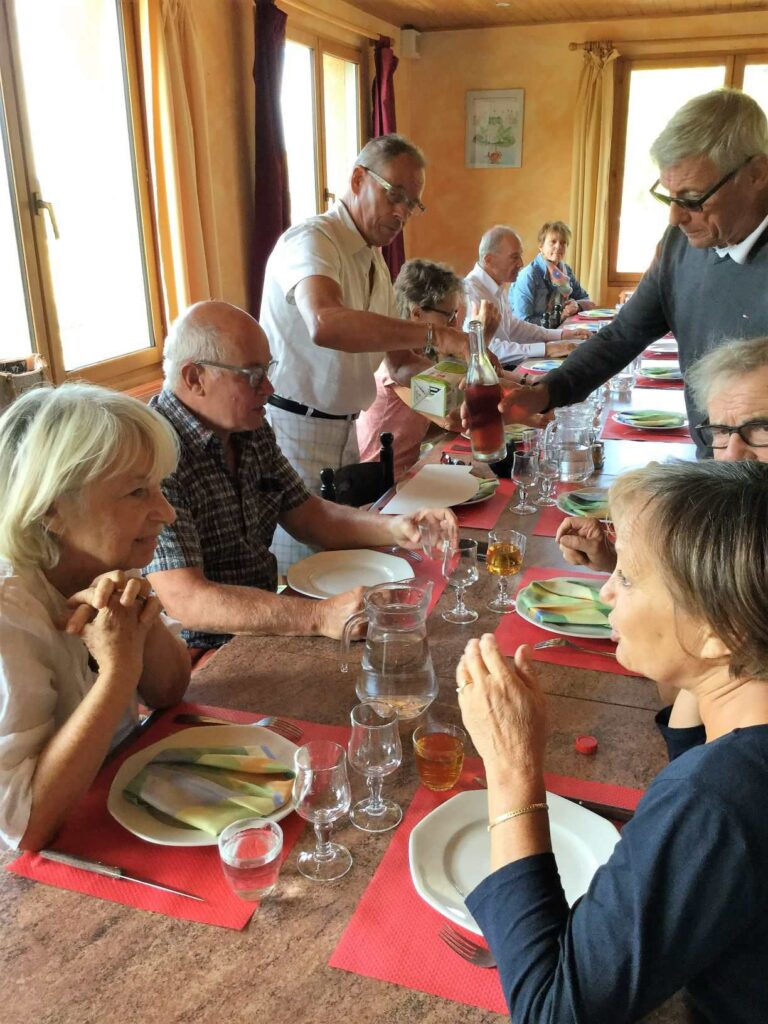 Après un bref et chaleureux petit déjeuner à Civrieux d’Azergues, lieu de départ de la sortie du jour, nous avons pris la route en direction de Salles Arbuissonnas pour la visite du Prieuré. Un tailleur de pierre faisait démonstration de son savoir faire et a permis à quelques un(e)s de s’exercer en utilisant ses outils appropriés. Après cette visite, nous avons repris nos véhicules pour rejoindre l’auberge « Le Chatoux Fleuri » à Sainte Paule. La cuisine familiale avec légumes du jardin fut très appréciée par l’ensemble du groupe. Puis nous avons passé l’après midi à Oingt avec une visite commentée par un des fondateurs du musée de la musique mécanique. Là encore , certain(e)s d’entre nous ont pu s’exercer au maniement des manivelles. Nous avons poursuivi cette journée ensoleillée par la visite du donjon qui offre une vue à 360° et une promenade dans ce charmant village. Nous avons clos cette journée par le verre de l’amitié.